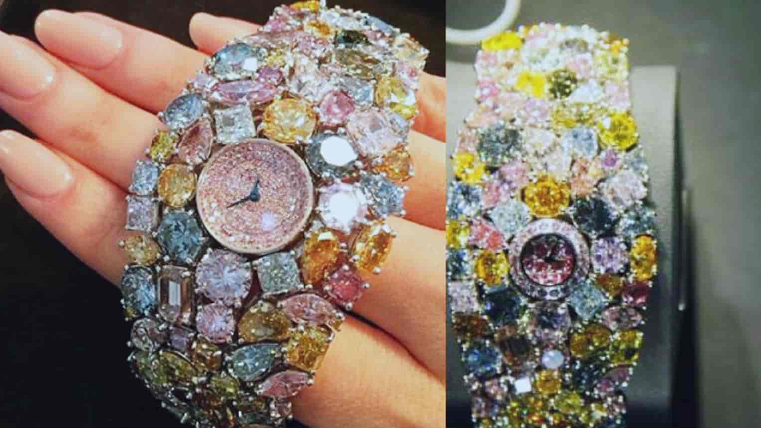 الساعة مرصعة بمجموعة من الألماس الملون، بما في ذلك ماسة وردية عيار 15 قيراطًا وماسة زرقاء عيار 12 قيراطًا وماسة بيضاء عيار 11 قيراطًا.